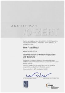 - Zertifizierter Sachverständiger für Kraftfahrzeugschäden und -bewertung (Bereich 4)